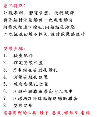 • 材質:鑄件部為鋁質,其它為鍍鋅板